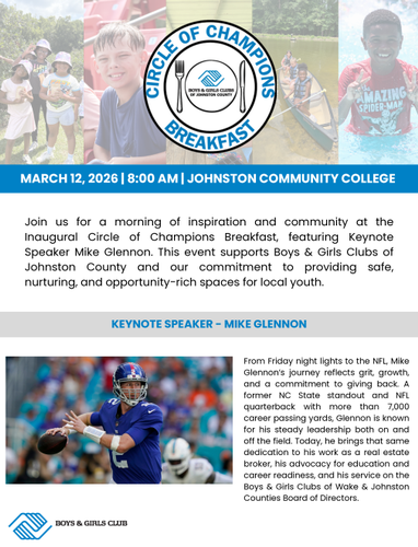 Join us for a morning of inspiration and community at the Inaugural Circle of Champions Breakfast, featuring Keynote Speaker Mike Glennon. This event supports Boys & Girls Clubs of Johnston County and our commitment to providing safe, nurturing, and opportunity-rich spaces for local youth.