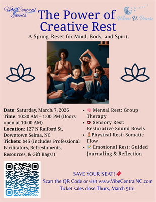 Your ticket includes access to these professional facilitators, light refreshments, wellness resources, and a curated gift bag to help you continue your rest practice at home.